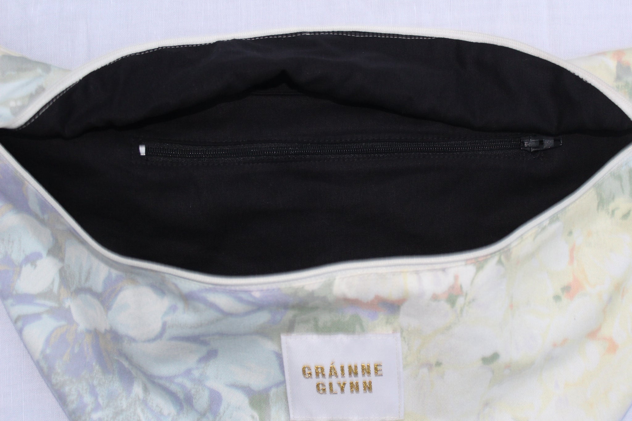 This crossbody is made from vintage pastel fabric with zip closure and inside pocket.