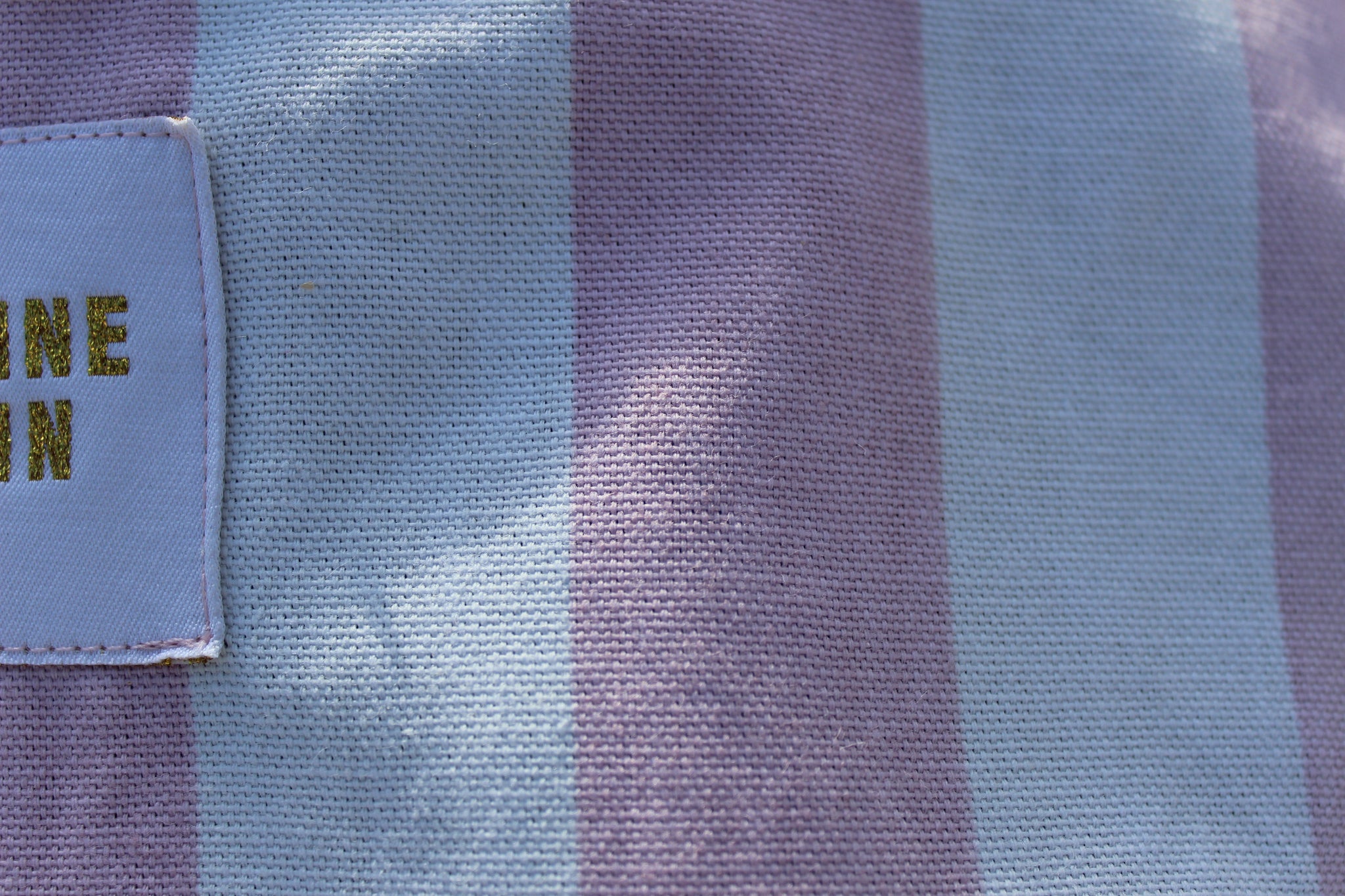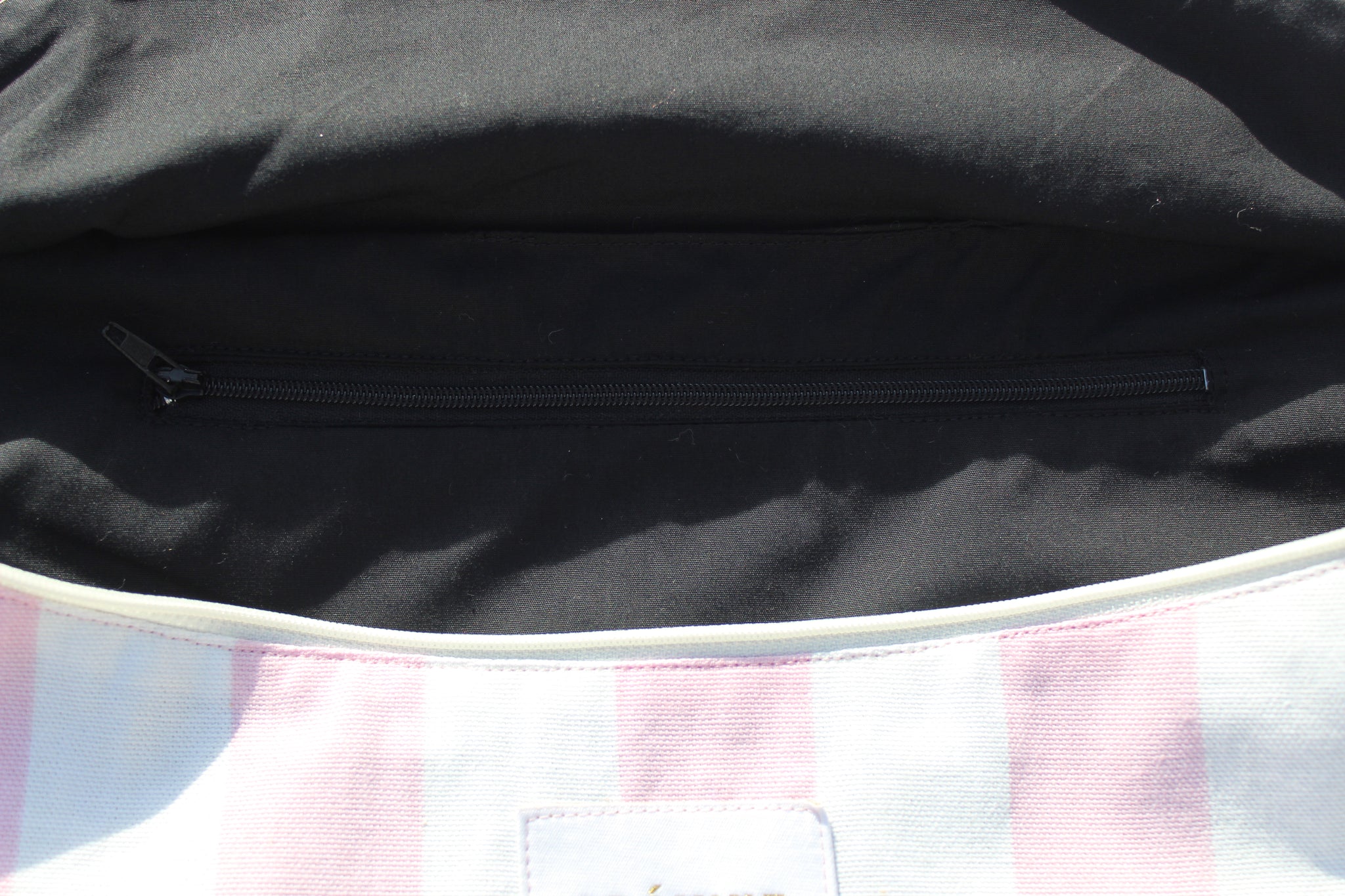 This crossbody is made from vintage pink and white striped fabric with zip closure and inside pocket. It has an adjustable strap allowing you to wear it around the waist or across the chest.
