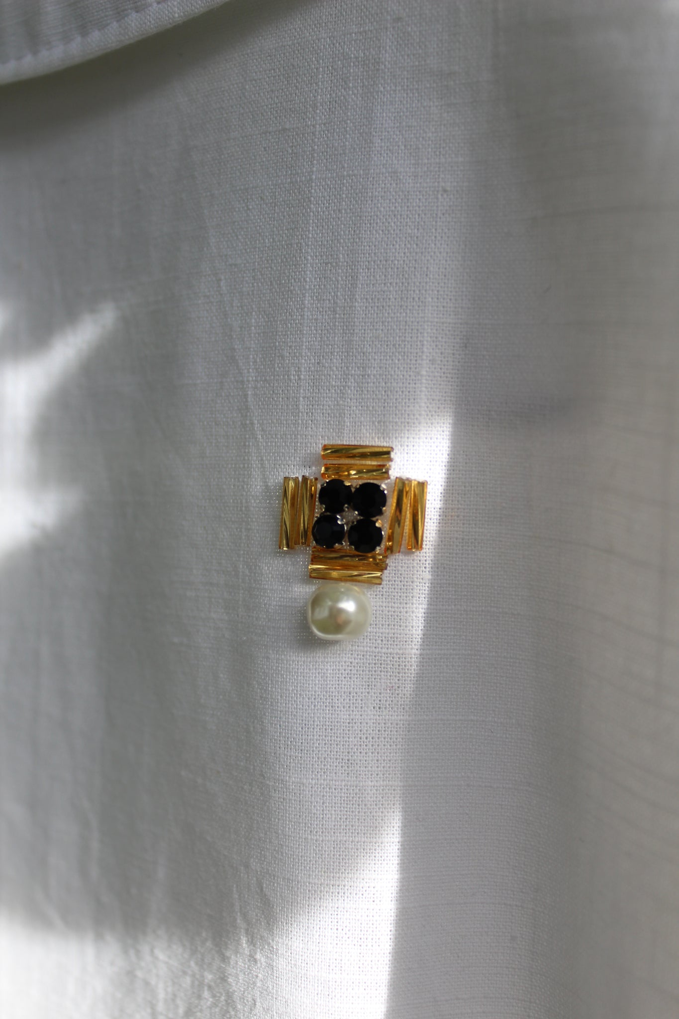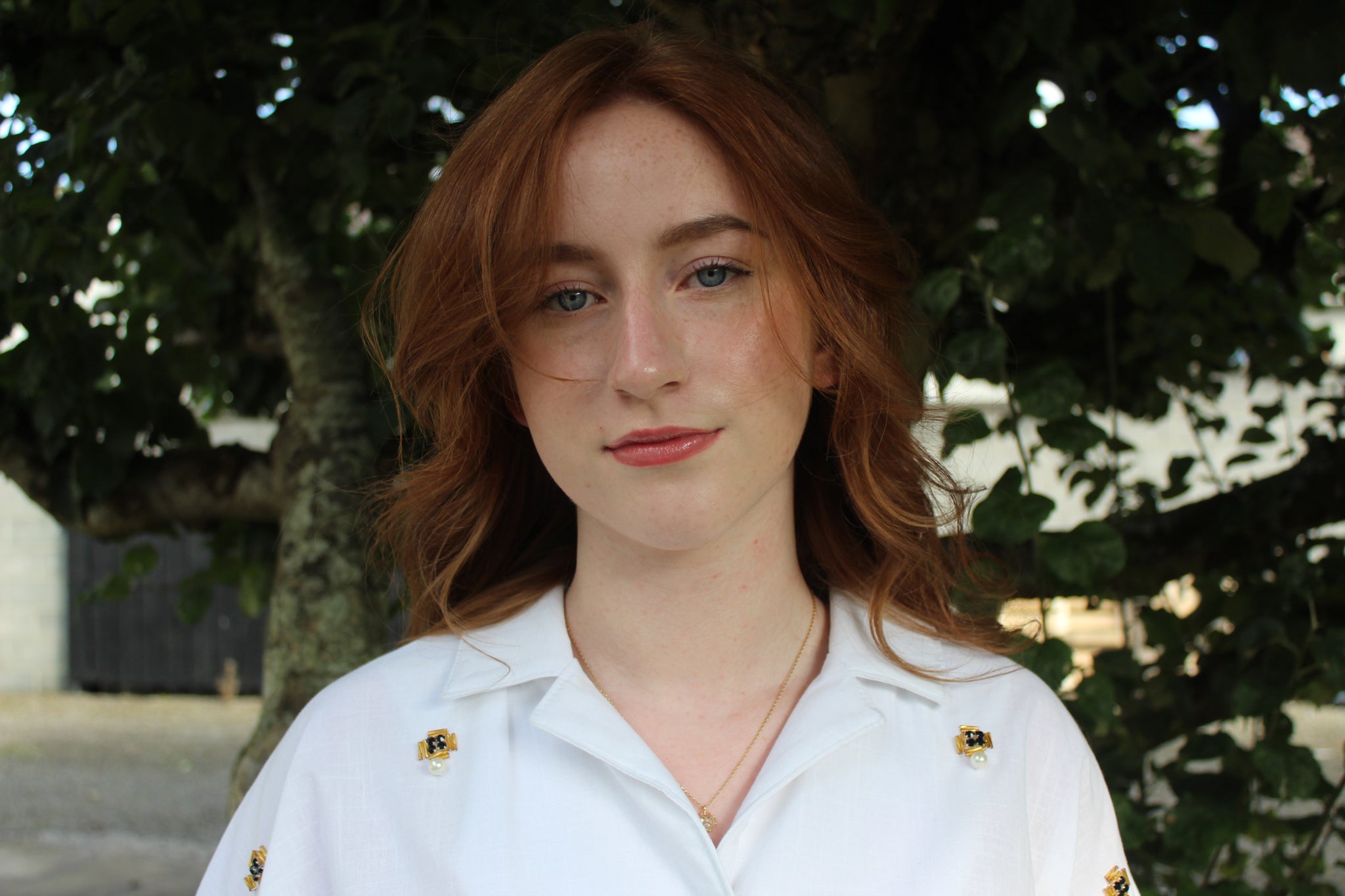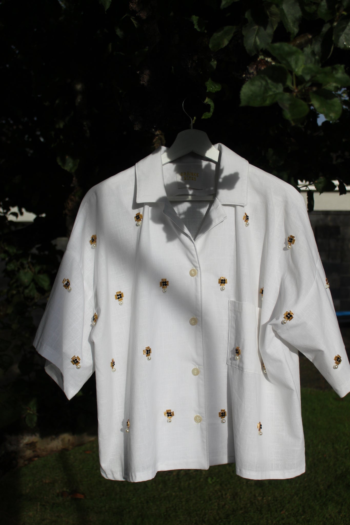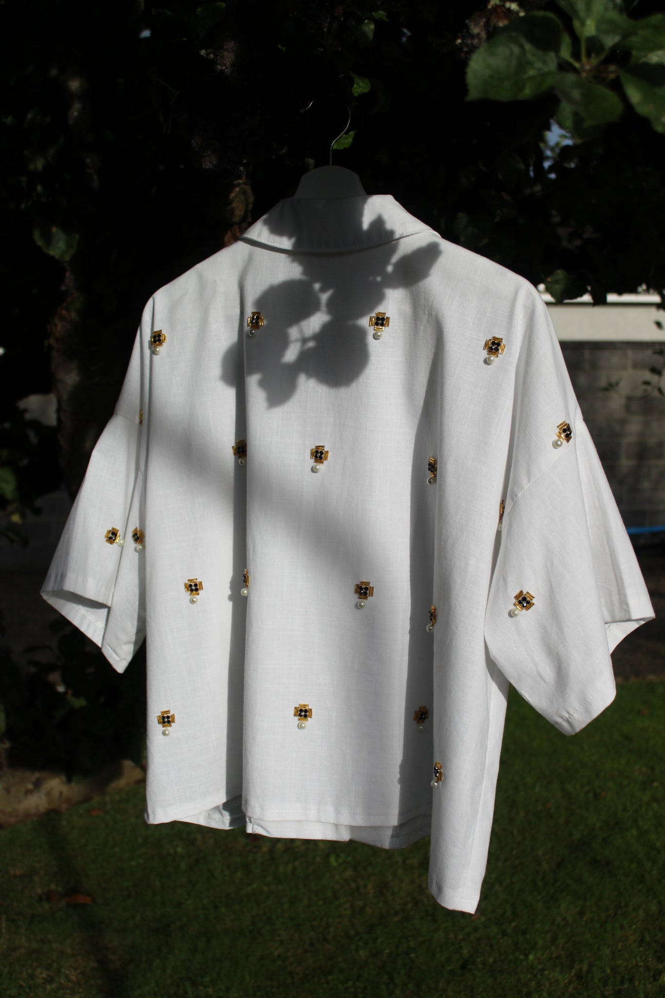 This is a lightweight cotton blouse with button closure and patch pocket with glass and pearl beading. It is a size 12-14 and is slightly cropped and boxy fitting.