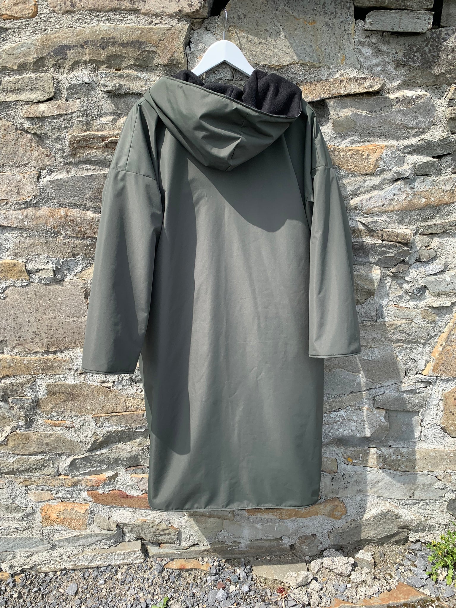 Waterproof, windproof and lightweight. This changing robe is guaranteed to warm you up post swim or pitch side. The inside consists of ultra warm anti-pil polar fleece in black. The outside is made from waterproof, windproof Öeko-Tex® olive green microfibre fabric. The robe has two fleece lined outer pockets, a zip up inside pocket and velcro straps at the cuffs for a snug fit. The two-way zip at the front is a durable YKK zipper.