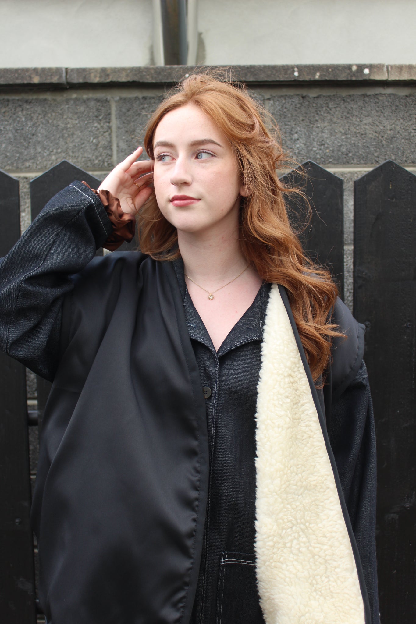 This is an oversized satin and faux sheepskin vest. It has two side seam sheepskin pockets and is lightweight yet warm.