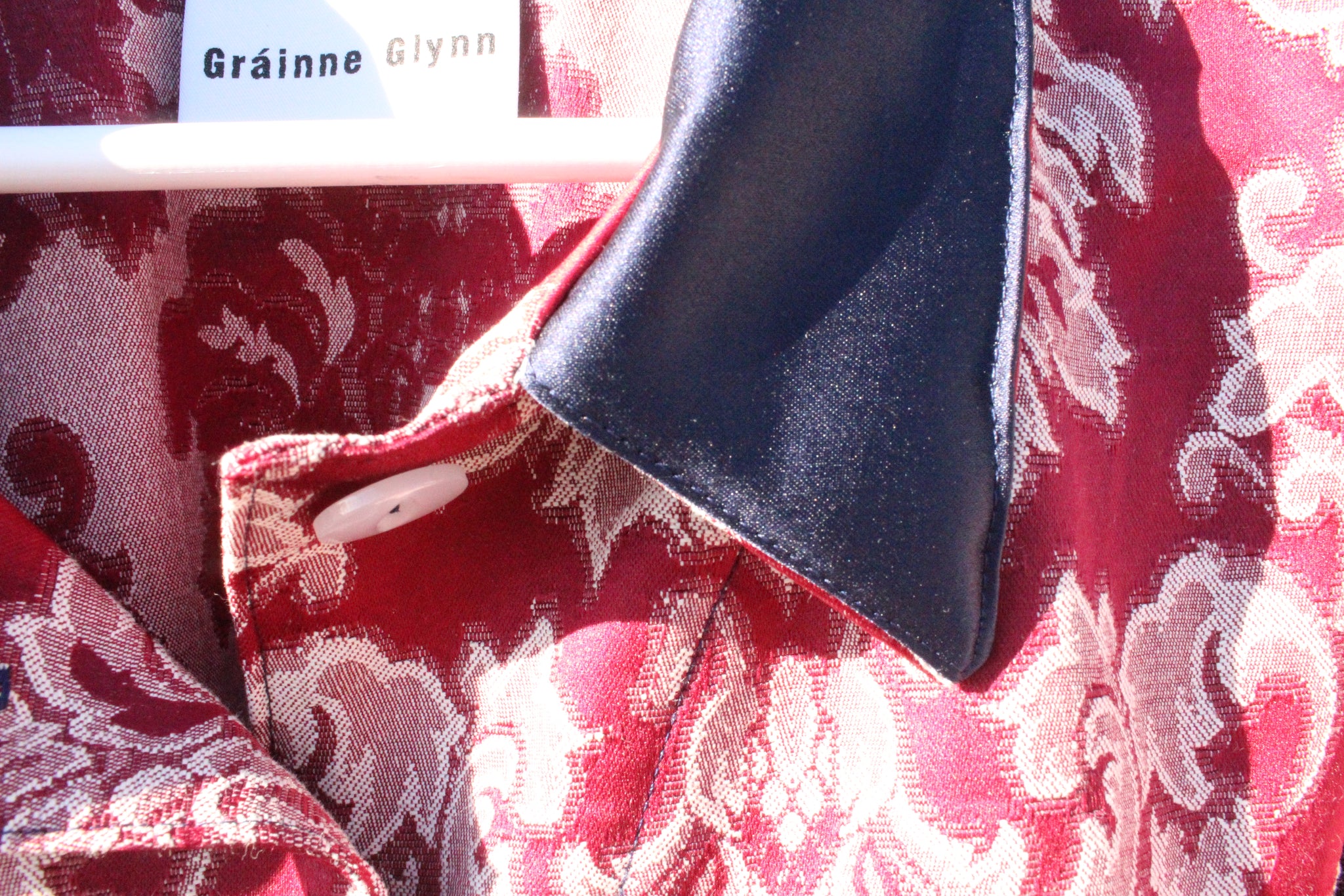 This is a lightweight red and navy jacquard chore jacket with two patch pockets and button closure. It is a size 12-14.