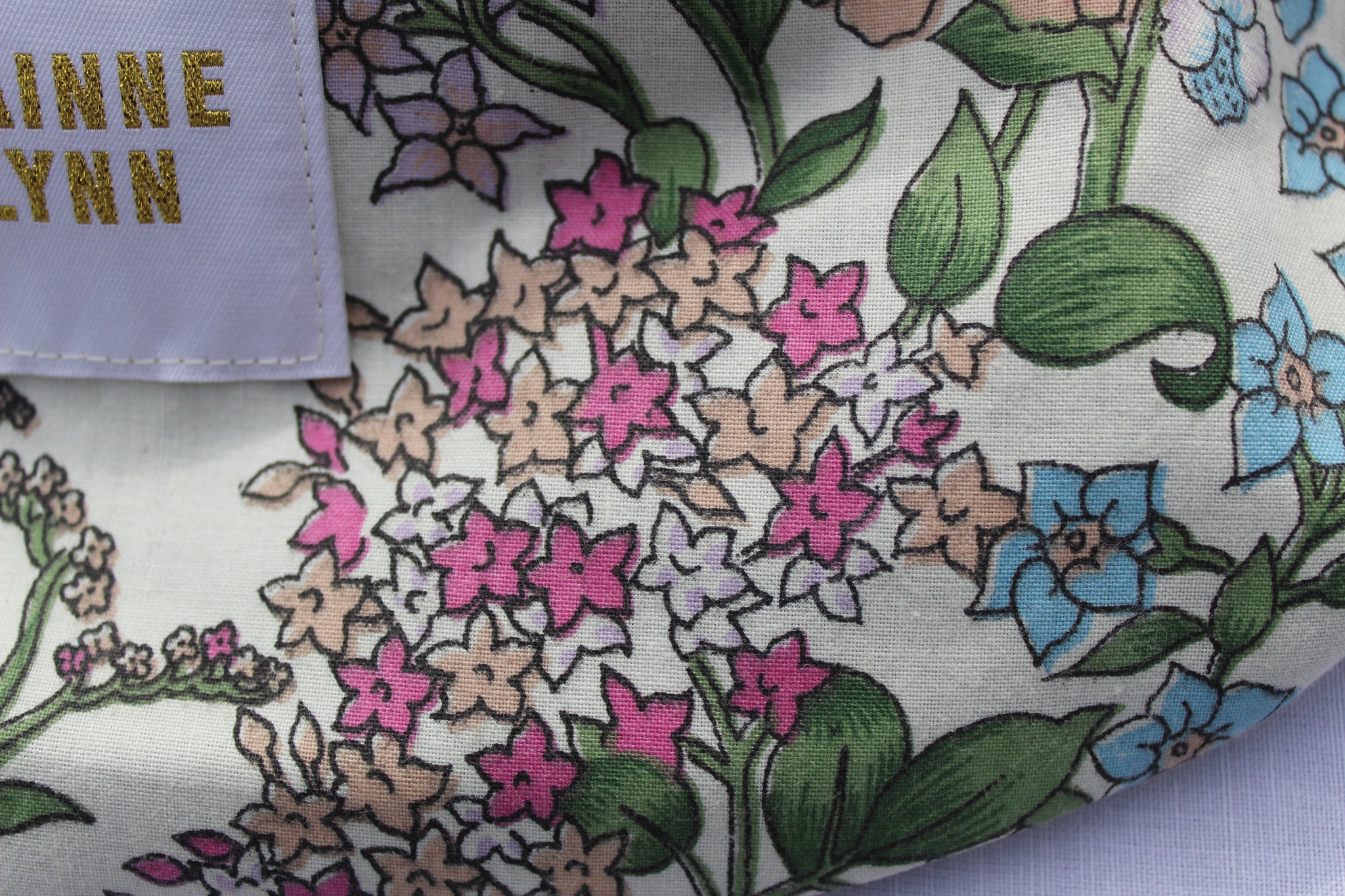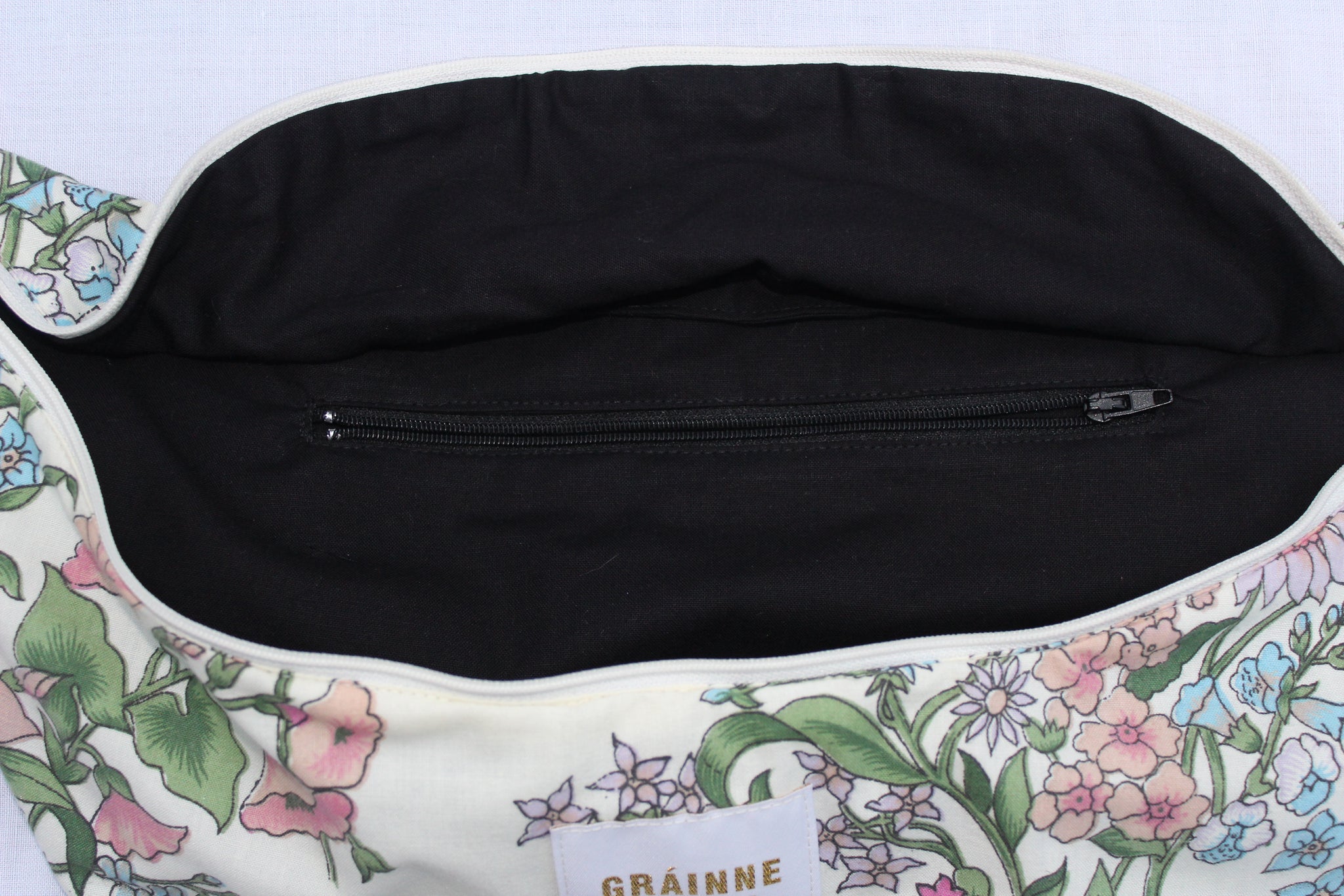 This crossbody is made from vintage floral fabric with zip closure and inside pocket.